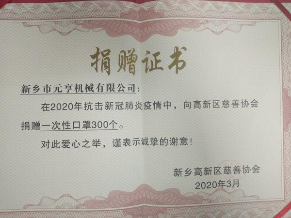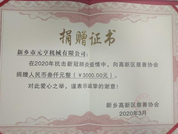 新鄉(xiāng)市元亨機(jī)械有限公司,自2004年建廠十多年以來,積極投身社會(huì)公益事業(yè)中來,這次疫情到來之際,我們**時(shí)間向當(dāng)?shù)丶t十字會(huì)捐款捐物,為疫情的控制盡我們企業(yè)自己的一份力。