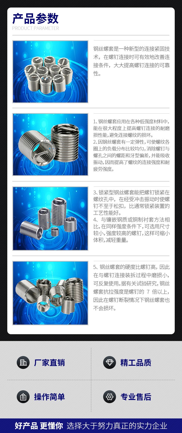 簡易螺紋護(hù)套安裝工具有螺紋頭、光桿兩種。用于少量安裝,一般維修、實(shí)驗(yàn)時用,操作時不易安裝,鋼絲螺套容易報廢。