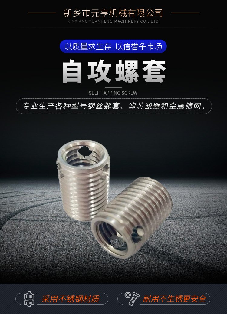 使用標(biāo)有規(guī)定螺紋規(guī)格的鋼絲螺套專用絲錐攻絲,攻絲的長度必須超過鋼絲螺套長度,對于通孔,要全部攻絲;攻絲的精度決定終標(biāo)準(zhǔn)內(nèi)螺孔的公差帶,使用者要適當(dāng)?shù)剡x擇攻絲方法和潤滑,盲孔攻絲要適當(dāng)用力, 以防折斷絲錐。攻絲后,螺紋孔應(yīng)清理,一般用壓縮空氣噴槍吹,盲孔時還應(yīng)使用帶徑向孔的長噴槍自下而上清理, 也可以用清洗的方法清理螺紋孔。螺紋孔精度高時,應(yīng)用專用鋼絲螺套底孔塞規(guī)進行檢查。