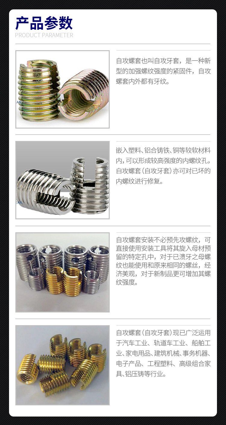 鋼絲螺套在安裝后,一般通孔都要求將尾柄去除掉,具體方法是用沖斷器對準(zhǔn)安裝柄,用200g的榔頭猛打一下,即可去除,對于18X2.5以上的粗牙絲套和14X1.25以上的細(xì)牙絲套,用尖嘴鉗上下彎曲安裝柄就能折斷。
