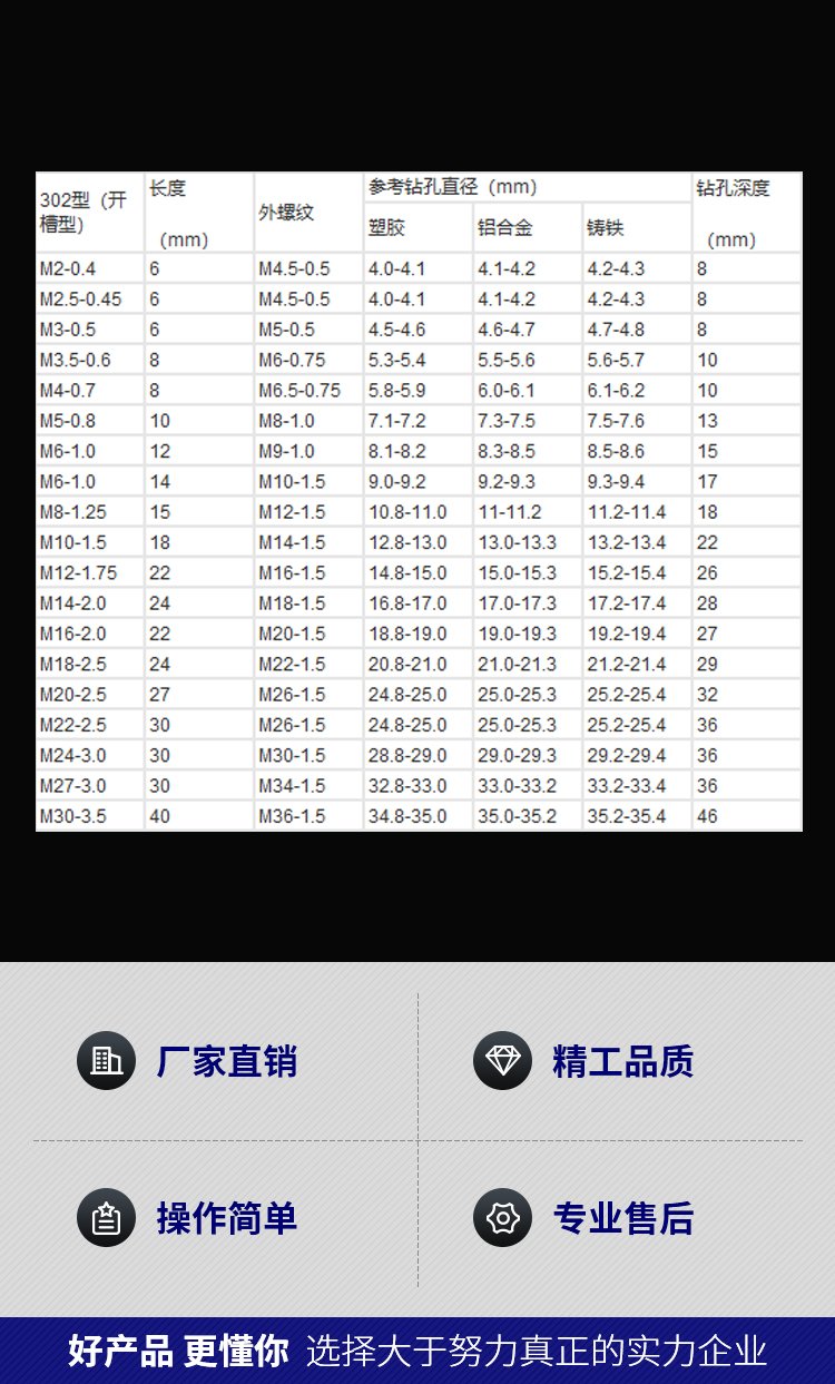表1 公制(M、MJ)系列粗牙鋼絲螺套參數(shù)表 單位:(mm)