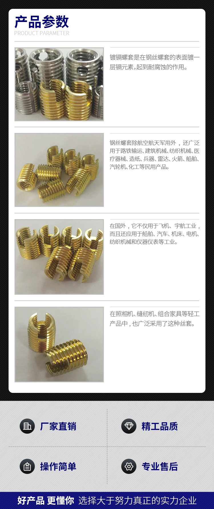 簡(jiǎn)易螺紋護(hù)套安裝工具有螺紋頭、光桿兩種。用于少量安裝,一般維修、實(shí)驗(yàn)時(shí)用,操作時(shí)不易安裝,鋼絲螺套容易報(bào)廢。