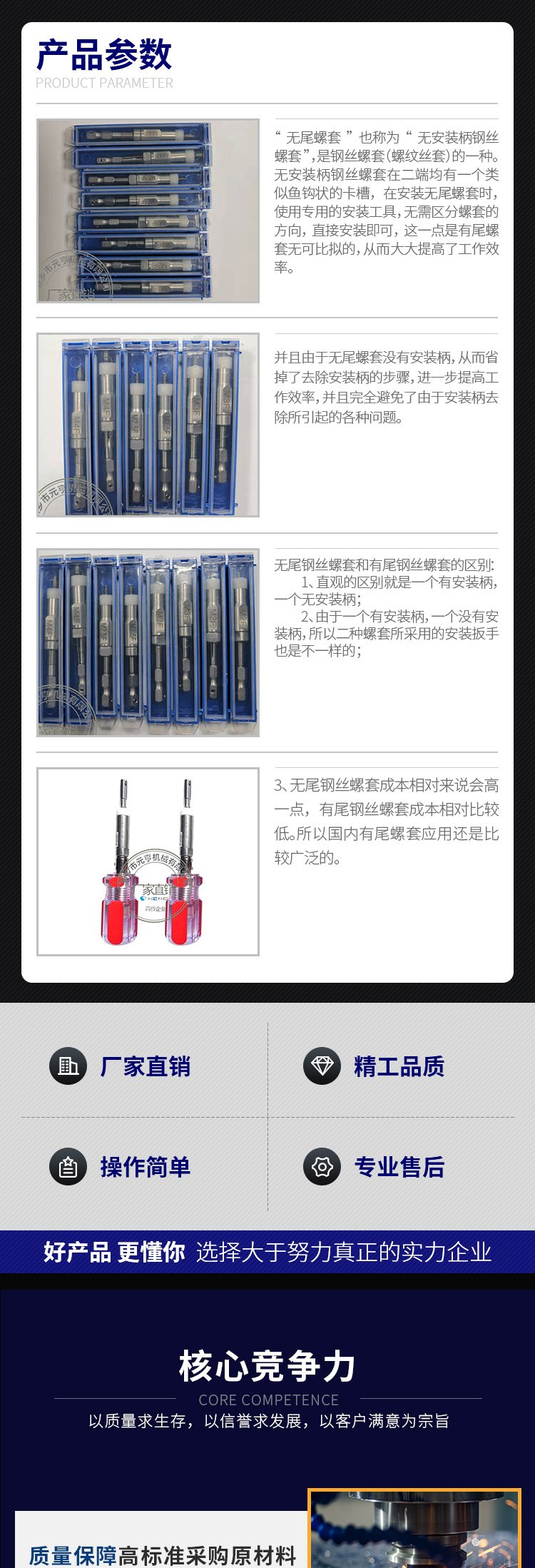 簡易螺紋護套安裝工具有螺紋頭、光桿兩種。用于少量安裝,一般維修、實驗時用,操作時不易安裝,鋼絲螺套容易報廢。