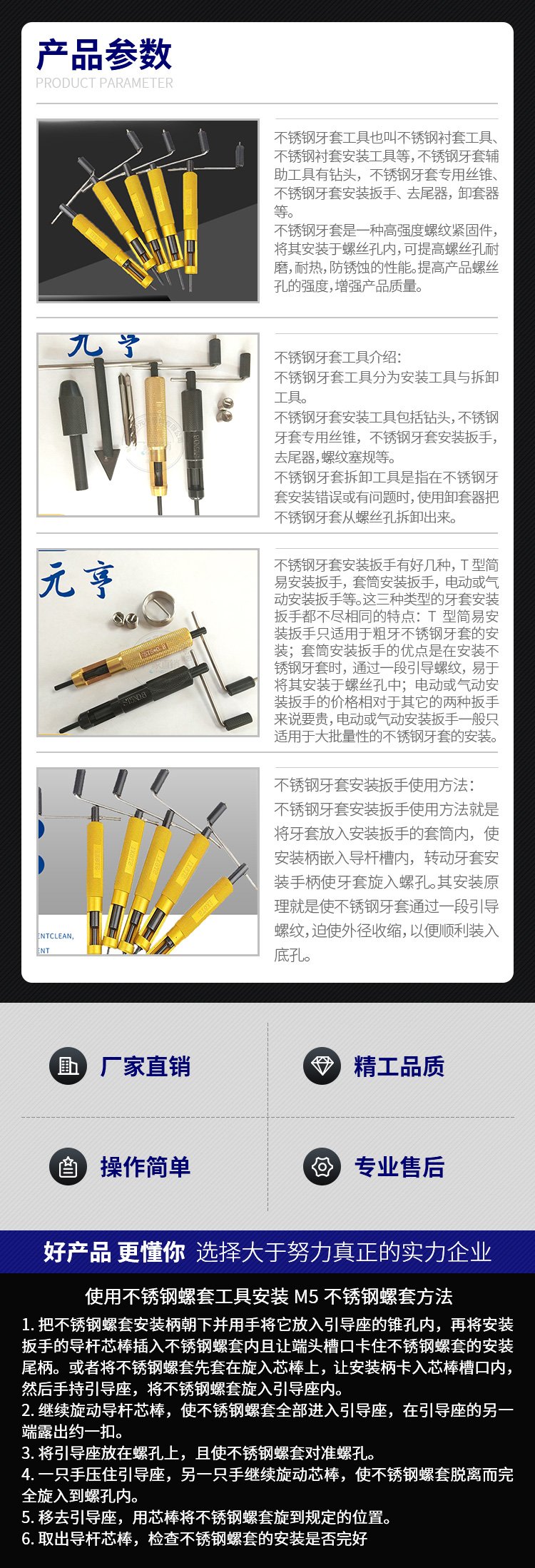 簡易螺紋護(hù)套安裝工具有螺紋頭、光桿兩種。用于少量安裝,一般維修、實(shí)驗(yàn)時(shí)用,操作時(shí)不易安裝,鋼絲螺套容易報(bào)廢。