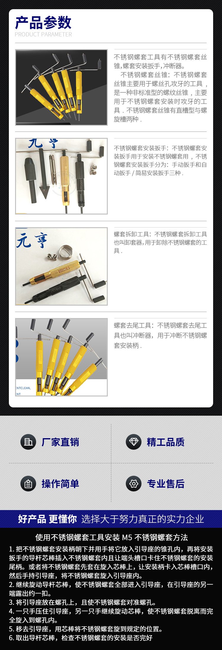 簡(jiǎn)易螺紋護(hù)套安裝工具有螺紋頭、光桿兩種。用于少量安裝,一般維修、實(shí)驗(yàn)時(shí)用,操作時(shí)不易安裝,鋼絲螺套容易報(bào)廢。