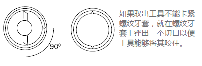 正確的放置位置能夠使拆卸變得更加容易,因此工具應(yīng)從螺牙開始部分轉(zhuǎn)動90°,使其能夠從螺紋牙套中很容易地旋出。